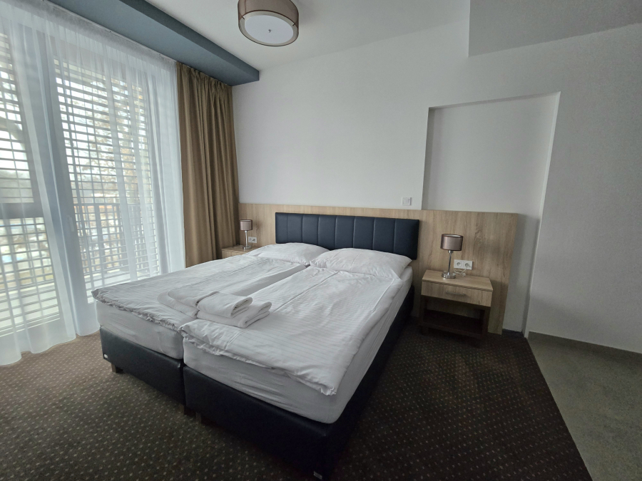 Apartmány na 1. a 4. poschodí s výťahom ponúkajú komfortné ubytovanie. Apartmány majú manželskú posteľ a obývačku s rozkladacím gaučom, ktorý je vhodný pre maximálne 2 osoby (matrac s rozlohou: 160 cm x 190cm). Súčasťou je aj jedálenský stôl so stoličkami. Apartmán je tiež vybavený trezorom, klimatizáciou, šatníkovými skriňami a skrinkami, pracovným stolom so stoličkou a dvomi TV. Niektoré apartmány majú balkón. Hostia majú k dispozícii aj župany a uteráky. Kúpeľňa je vybavená sprchou.