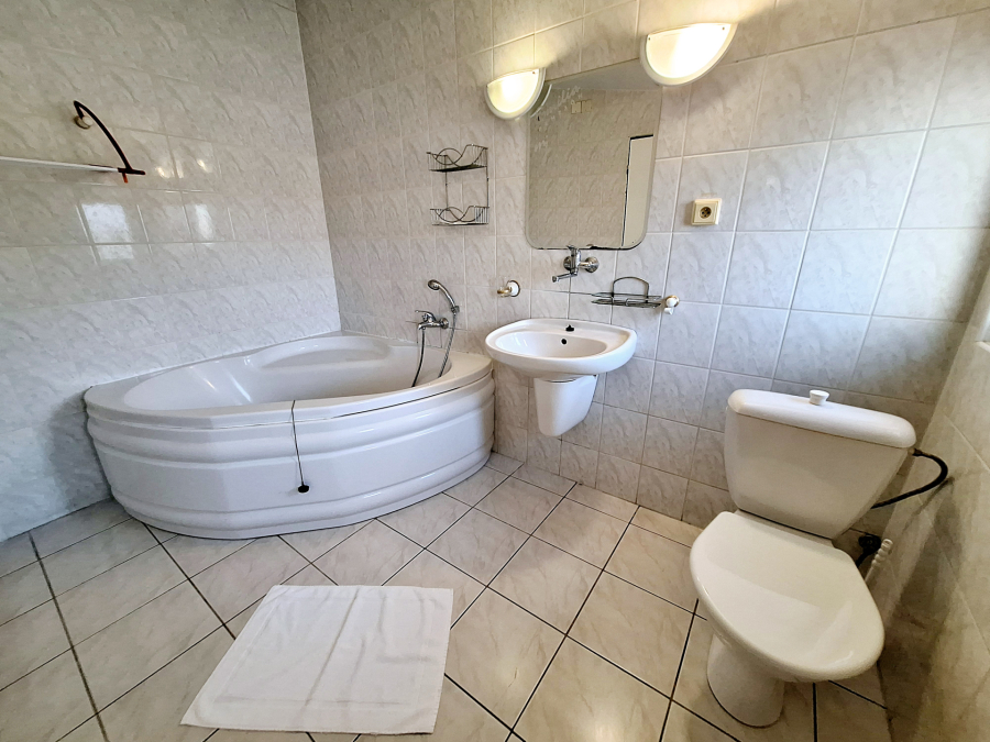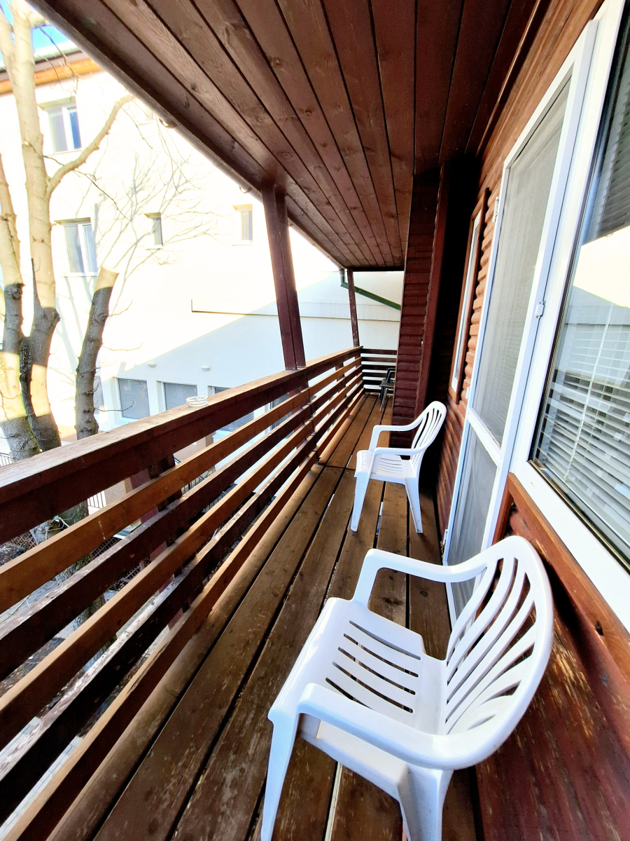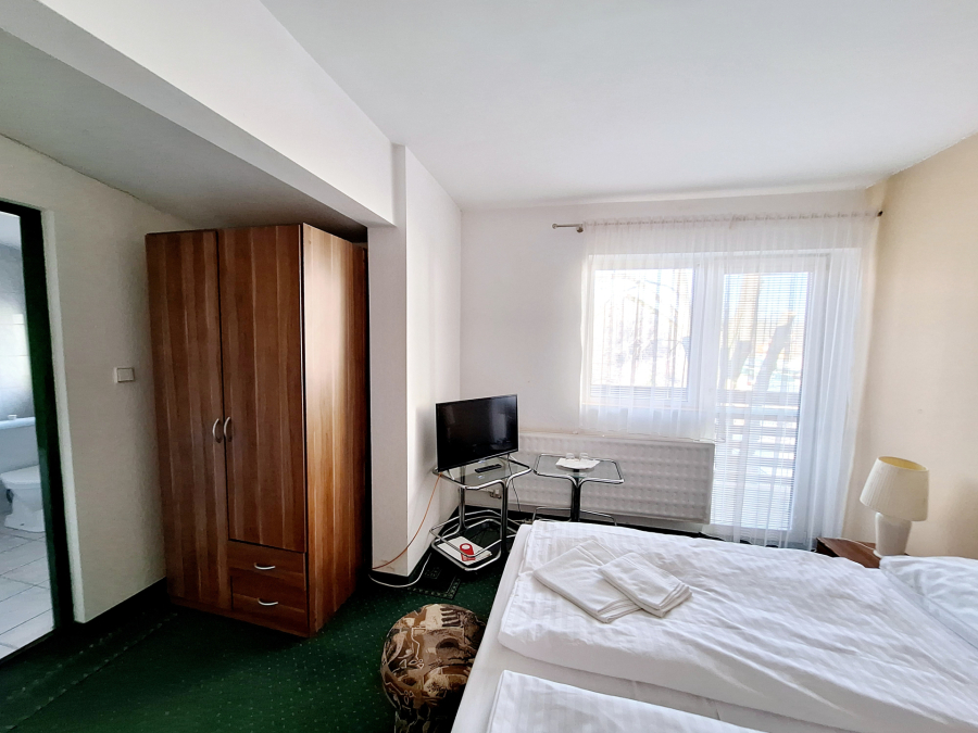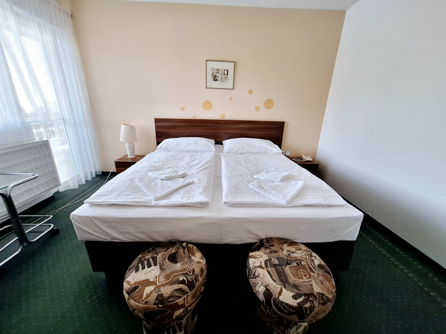 Dvojlôžková izba s manželskou posteľou sa nachádza na 1. poschodí (bez výťahu). Súčasťou vybavenia je šatníková skriňa pre praktické uskladnenie vecí, kreslá alebo taburetky pre pohodlie a TV pre večerný oddych. Nájdete tu aj sušiaky na prádlo a dostatok županov a uterákov pre príjemný pobyt. Kúpeľňa disponuje sprchovým kútom alebo vaňou. Balkón ponúka príjemný výhľad na Bazén pri jazere a rybník.