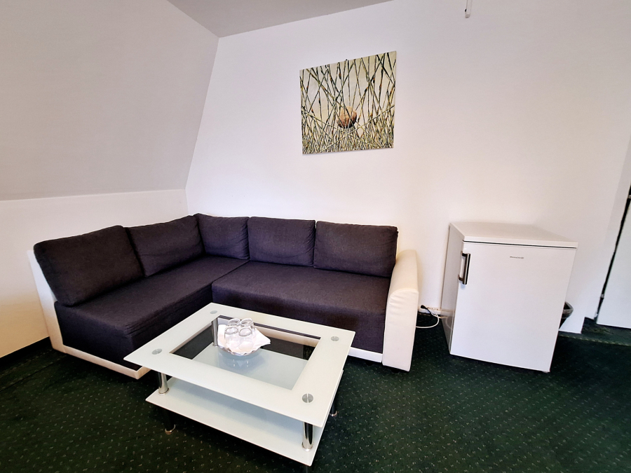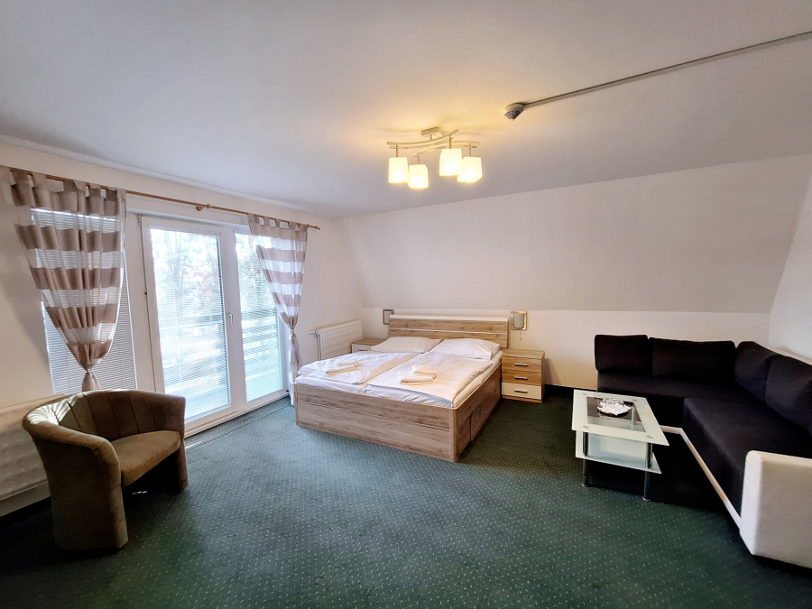 Dvojlôžková izba Klasik sa nachádza na 1. poschodí (bez výťahu). Disponuje manželskou posteľou a pohodlným rozkladacím gaučom, ktorý slúži aj ako prístelka pre max. 2 deti do 15 rokov (do 14,99 r.). Šatníková skriňa, stoličky / taburetky a TV pridávajú izbe komfort a praktickosť. K dispozícii tu nájdete aj chladničku pre uskladnenie nápojov či potravín. Kompletné vybavenie dopĺňa kúpeľňa so sprchou alebo vaňou, sušiaky na prádlo a dostatok županov a uterákov. Balkón ponúka priestor na oddych s výhľadom.